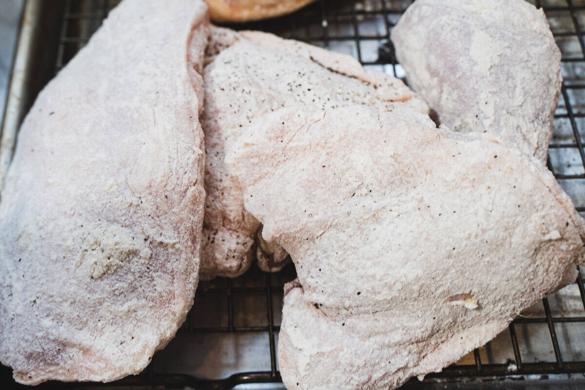 - Get Ready. Pat your chicken dry and set up a shallow plate (like a pie plate) of flour seasoned with salt and pepper. This is a quick mise-en-place that makes the rest of the recipe feel easy. (My Table Talk Tip: dry skin = great browning.)
