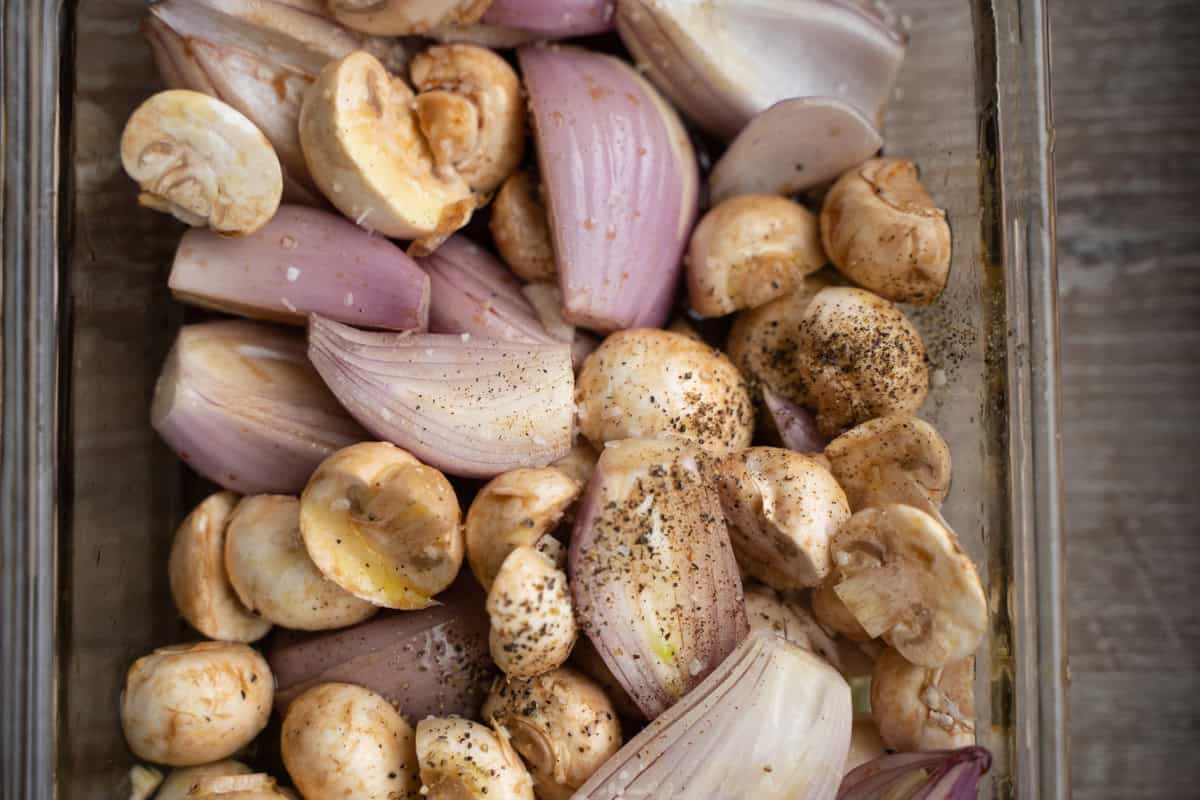 Start by tossing your shallots and mushrooms into a baking dish with 1 tablespoon olive oil and 1 tablespoon balsamic vinegar.