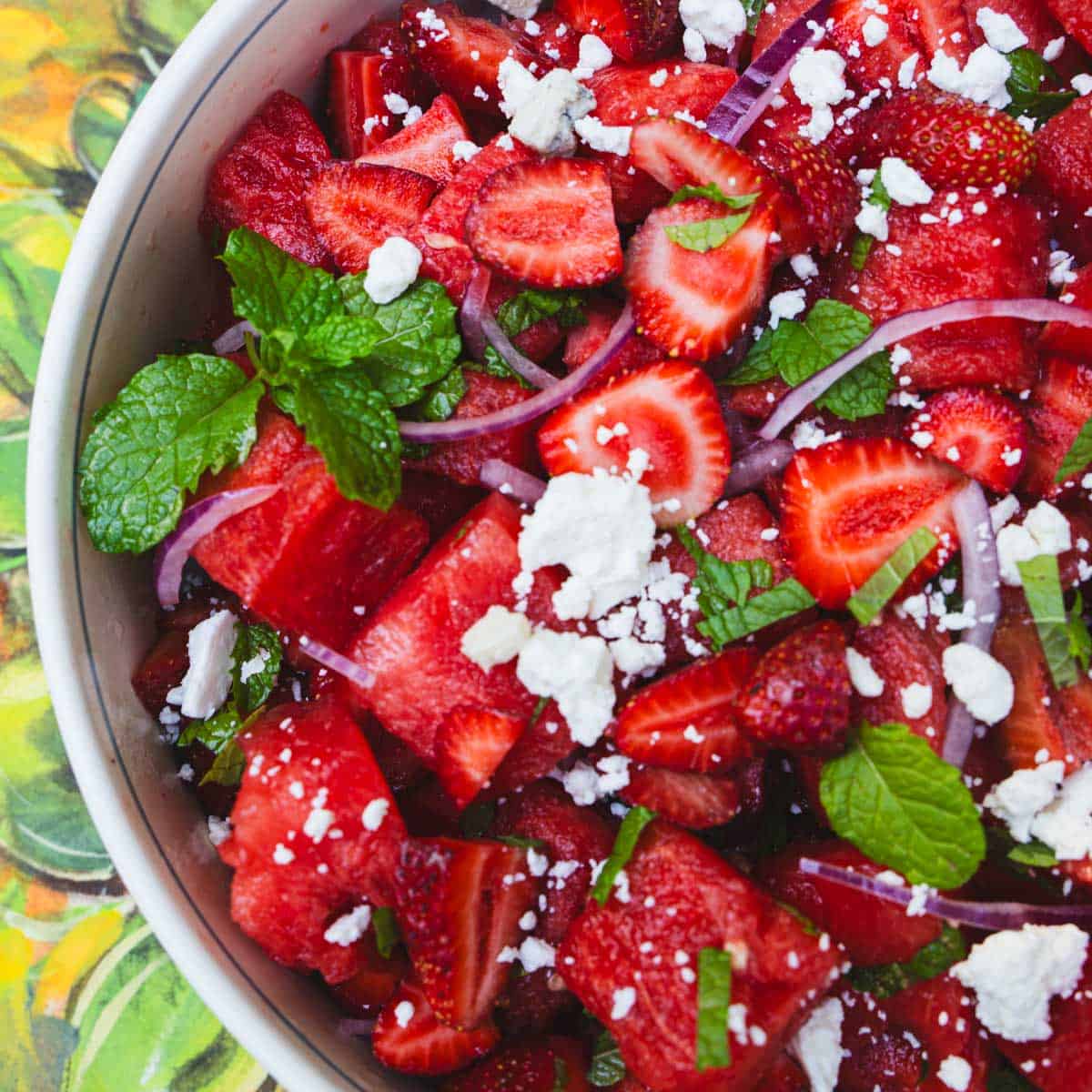 In a large bowl combine, watermelon, strawberries, red onion and mint leaves.