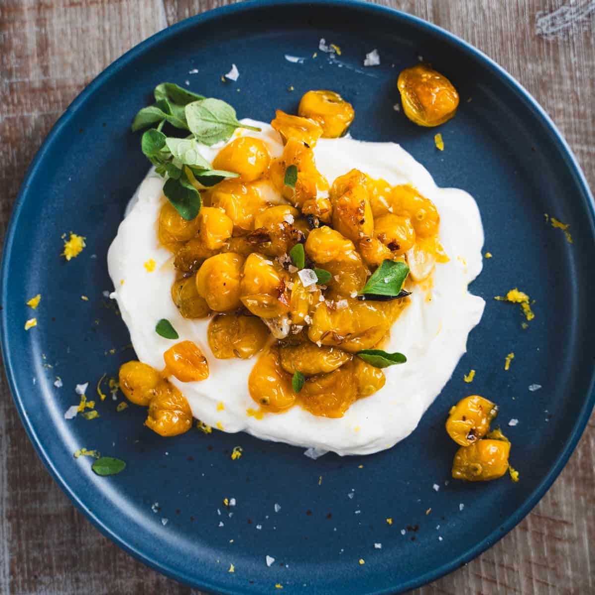 One of the beauties of this Ground Cherries Recipe lies in the exciting contrast between hot, juicy ground cherries and fridge-cold ricotta, so make sure the cherries are straight out of the oven and the ricotta is straight out of the fridge. The heat of the cherries will make the cold ricotta melt, invitingly, so plenty of crusty sour dough orfocaccia to mop it all up is a must alongside.