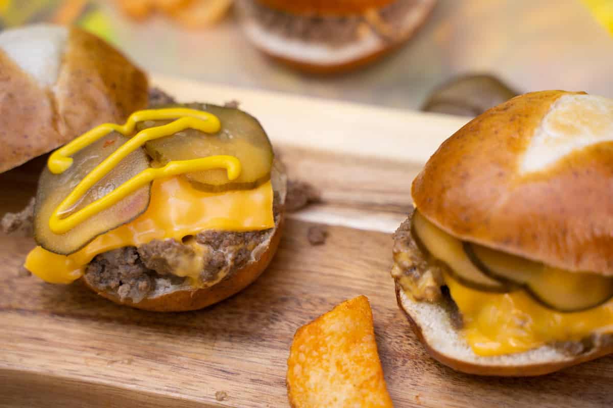 Spread extra mustard on bun bottoms then, using slotted spoon, mound beef mixture over top. Cap with pickles and bun tops brushed with more mustard. Serve immediately.