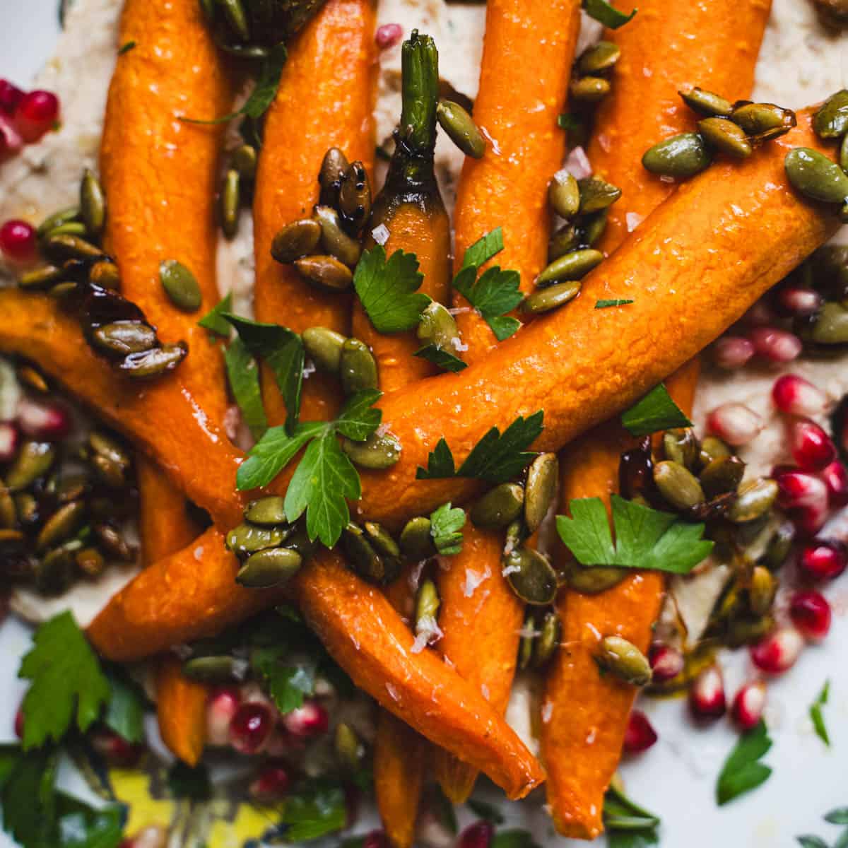 When ready to serve, spread the white bean puree over the base of a serving platter. On the baking sheet, mix the carrots with parsley and red pepper flakes. Place carrots on top of the bean puree. Scatter extra herbs, pepitas and pomegranates on top. Sprinkle with flaked salt and serve.